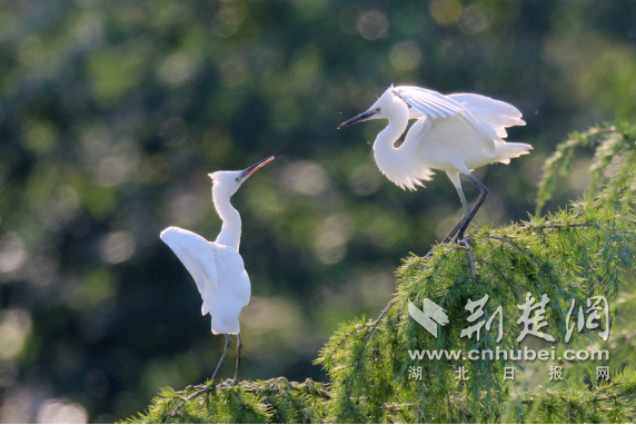 鄖西縣天河流域白鷺幼鳥枝頭嬉戲玩耍。賈庚春 攝