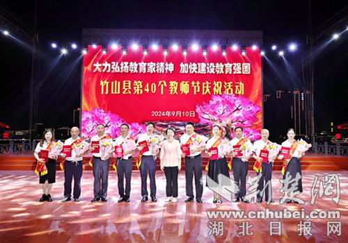 在桃花源街區(qū)廣場,竹山縣委縣政府向全縣廣大教師致以節(jié)日祝賀,為2024年度“荊楚好老師”胡玲玲,第十屆愛崗敬業(yè)教師朱訓林等10名教師頒獎??h委,縣政府、縣人大、縣政協(xié)四大家領(lǐng)導和各單位及廣大市民一起共同歡慶教師節(jié)。