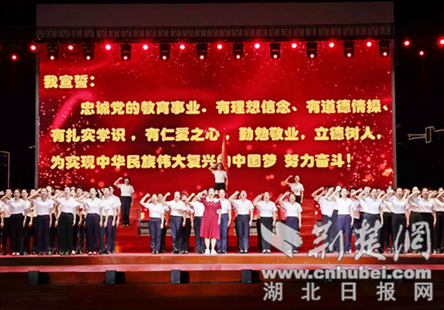 桃花源街區(qū),教師登臺獻藝。德藝雙馨的教師們自編自演《初心鑄師魂》、《鑄就中華魂》、《做老師真好》、《中國龍》等,舞臺上,參演教師用炫麗的歌舞,深情的語言、真摯的情感,真情演繹教育精彩。