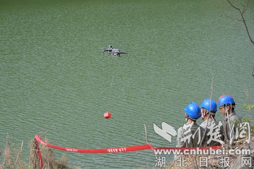 湖北十堰供電公司員工操縱無人機飛越山谷、河流,為220千伏汾當線166至168號鐵塔投放驅鳥劑。通訊員 攝制