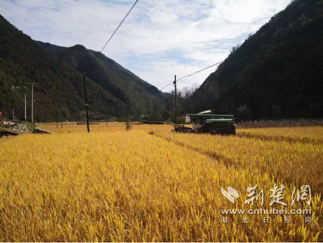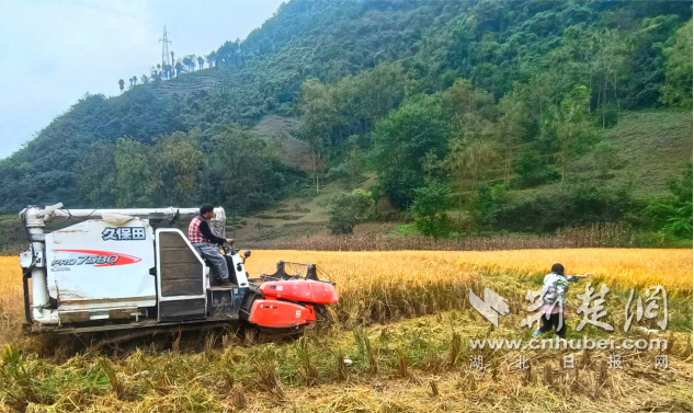 荊楚網(湖北日報網)訊(通訊員 陳輝佳)9月24日,筆者獲悉,隨著金秋時節的到來,水稻陸續進入收割期。在鄖西縣槐樹林特場稻田里,一簇簇稻穗籽粒飽滿,微風輕撫下,掀起層層稻浪,稻田在陽光照耀下美輪美奐,猶如給大地鋪上一層金黃的地毯。