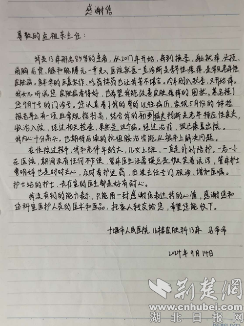 7年瘙癢一朝除 8旬大爺手寫感謝信表感謝