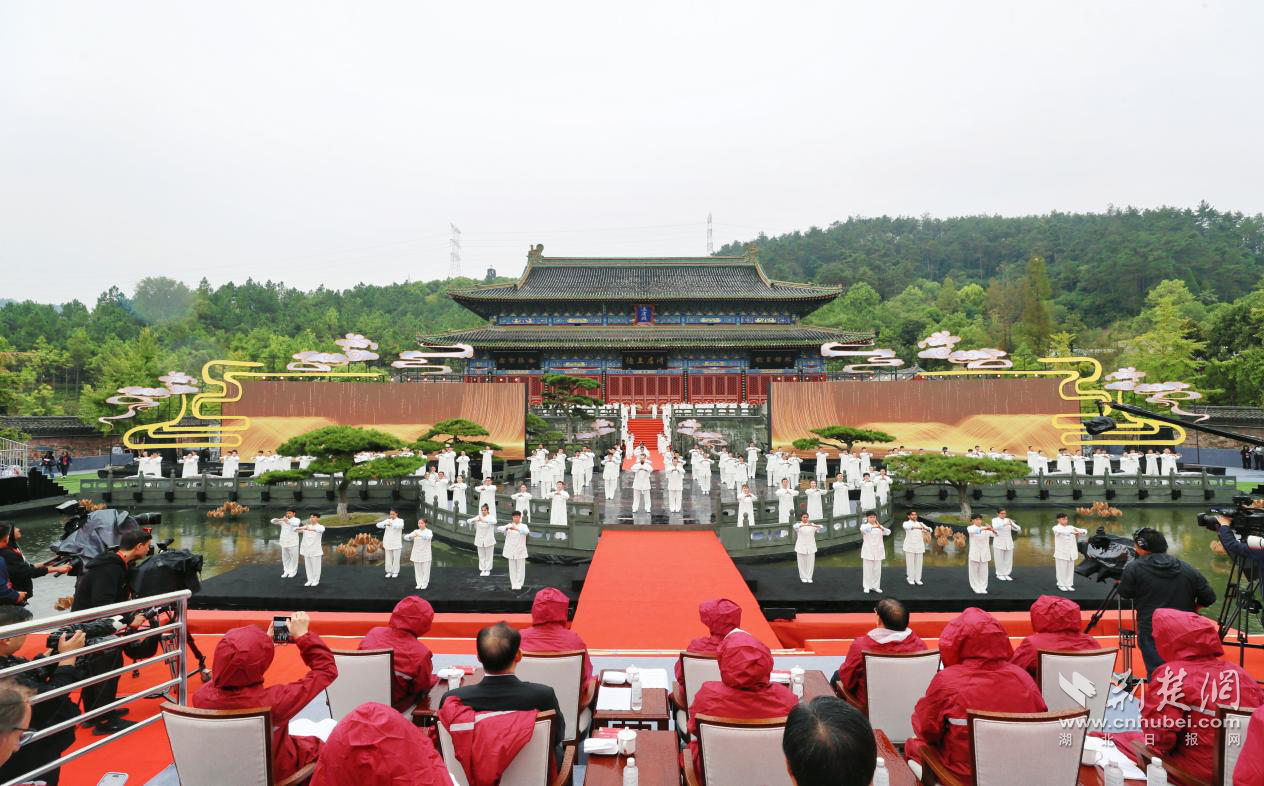 大會開幕式以“武當太極對話世界文明”為主題,開幕式設計遍布武當山玉虛宮(遺址)建筑群,賓客由山門進入,移步換景。行走于600余年歷史的古樸建筑之中,凝固的建筑歷史與發展的文化繁衍交相輝映。一路之上,禮樂迎賓、雅韻迎賓、太極迎賓等歡迎儀式接踵而至,以文化為禮,迎四海賓朋;一路之上,琴箏悠悠,簫笛婉轉,撫香弄茶、草藥炮制、書寫對弈,更有千人太極招式有序、身法自然,亦有哲思之聲縈繞耳畔、明道古今……太極文化含納廣泛,底蘊深厚。行進中,一場別開生面的文化盛宴緩緩鋪陳。