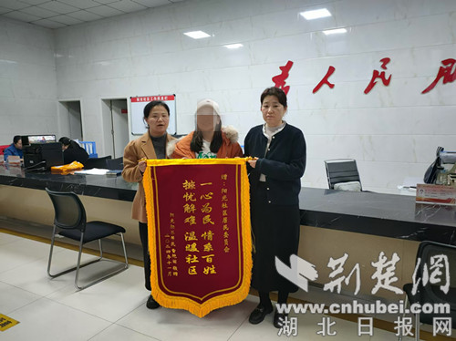 荊楚網(湖北日報網)訊(通訊員袁晨星 庹曉燕)11月12日,張灣區漢江路街道陽光社區出現了暖心一幕。身患癌癥的雷女士在家人陪伴下,手捧一面寫有“一心為民情系百姓,排憂解難溫暖社區”的錦旗來到社區黨群服務中心,感激之情溢于言表。