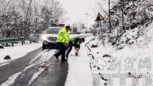 荊楚網(wǎng)(湖北日報網(wǎng))訊(通訊員張捷 盧瑤)“師傅,前面轉(zhuǎn)彎處有積雪,路上開慢點(diǎn)兒,一定要注意安全!”11月17日上午,湖北省十堰市鄖西縣公安局湖北口派出所民警在轄區(qū)易積雪路段開展路面巡查,勸導(dǎo)過往車輛。