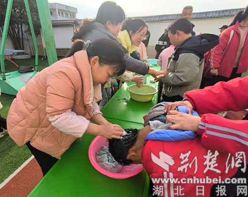活動現場,全體教職員工齊動手,給每一位學生進行洗頭、洗腳、剪指甲、理發。在舉行此活動之前,學校黨支部做了精心的布置與分工,趁著暖和的陽光,先由后勤工作人員準備好熱水、洗發水、香皂、梳子、臉盆、毛巾等用品。接著,以班為單位,包班領導與教師參與到各班與班主任配合,合作完成洗梳剪的活動。此外,學校免費為每位學生發放校服和襪子。
