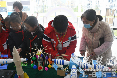 在科技作品展示區,琳瑯滿目的科技作品讓人目不暇接。參賽學生們發揮自己的想象力和創造力,利用廢舊物品、簡單材料和科學原理,制作出了各種各樣的科技作品。從利用廢舊材料制作的環保機器人,到巧妙構思的科技黏土畫,這些作品不僅展現了學生們的科技才華,也體現了他們對科學知識的熱愛和對未來科技的憧憬,一件件精致的科技作品成為了校園里的一道亮麗風景線,吸引學生們紛紛駐足觀賞。此次活動中,十堰市科技館的工作人員帶來了“磁力傳動擺”“最速降線”“錐體上滾”等各種富含聲、光、電、磁類科普展品。觀摩過程中,學生們熱情高漲,興致勃勃地穿梭于各個展臺之間,仔細地觀察、熱烈的討論,在零距離的接觸中,深入了解科學原理,親身感受到了科學世界的無限神奇,探索著其中的奧秘與精彩,現場充滿了濃厚的科學氛圍。