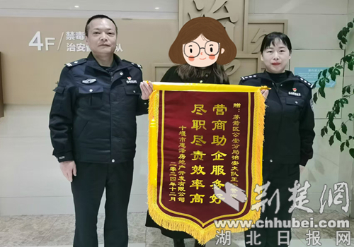 治安大隊高效的辦事效率,優質的服務,便捷的辦事流程贏得了企業的高度認可。12月10日,十堰市某房地產開發有限公司負責人將一面“營商助企服務好,盡職盡責效率高”的錦旗贈予治安大隊民警王寧。