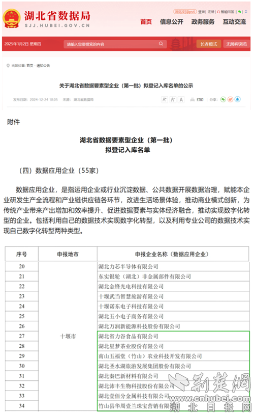 荊楚網(湖北日報網)訊(通訊員 李斌、王旭升、王關睿)近日,湖北省數據要素型企業(第一批)登記入庫名單已正式公布。經企業申報、逐級審核、專家評審等程序,共有竹山縣華周壹蘭珠寶營銷有限公司、湖北壹佰分金屬科技有限公司等8家竹山本土企業成功入選。