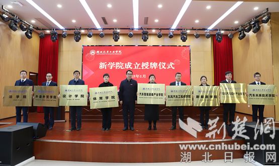 當日上午,學校還舉行了新學院授牌儀式。儀式上宣讀了《湖北汽車工業學院學科學院優化調整方案》《湖北汽車工業學院關于二級學院設置調整的決定》,并現場為新學院授牌。