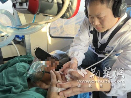 62歲的李爺爺在工作時(shí)不慎被電鋸將左手食指割斷,家屬將他緊急送往鄖西縣觀音鎮(zhèn)中心衛(wèi)生院進(jìn)行救治,觀音鎮(zhèn)中心衛(wèi)生院院長(zhǎng)鄭德才在得知情況后,第一時(shí)間指揮醫(yī)護(hù)對(duì)患者進(jìn)行緊急救治,并將患者斷指進(jìn)行妥善保存,考慮到患者斷指再植需爭(zhēng)分奪秒,鄭院長(zhǎng)緊急聯(lián)系十堰市人民醫(yī)院航空救援科,要求通過(guò)直升機(jī)將患者轉(zhuǎn)到十堰市人民醫(yī)院進(jìn)行救治。