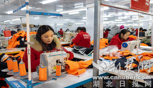 裁剪、縫制、整燙、打印訂單、發(fā)貨……1月2日,鄖西天河工業(yè)園區(qū)湖北新耀實業(yè)有限公司生產(chǎn)車間里,一臺臺縫紉機發(fā)出悅耳的聲響,生產(chǎn)車間全線開通,工人們都鉚足了干勁。