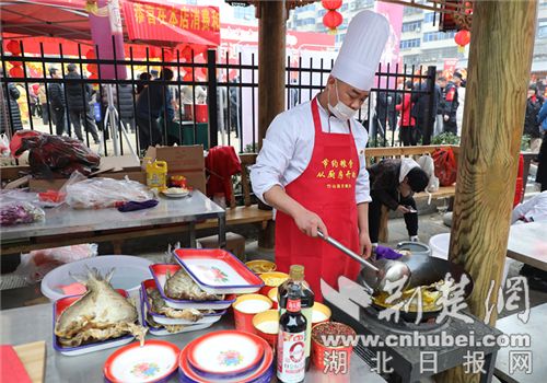 “我制作了一道竹山特色菜酸辣炒大雞,寓意著新的一年大家都大吉大利!”廚師龍超邊制作美食邊向圍觀的游客送祝福。