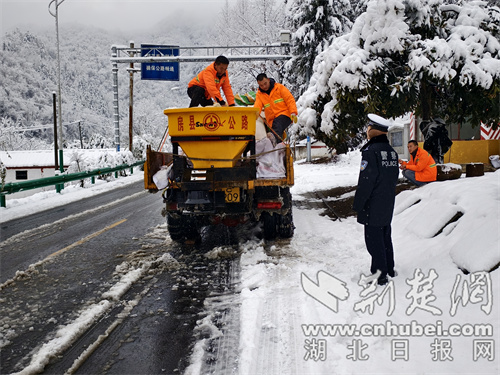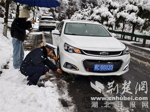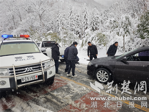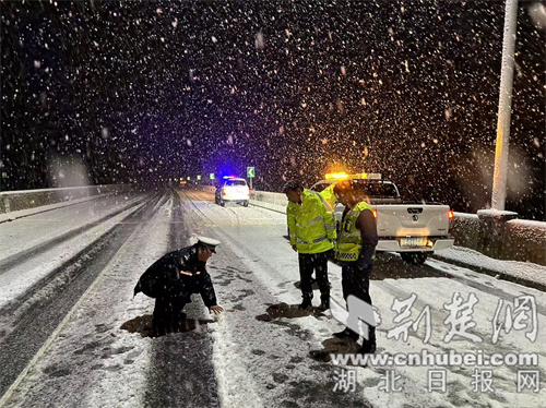 自24日晚至記者發稿前,在雨雪較大的鄖西縣、房縣、竹溪縣、鄖陽區、武當山等地,當地交管部門和派出所民警不間斷開展巡邏值守,在積雪較厚路段及時開展撒鹽除雪鏟冰工作,并服務提醒過往車輛,幫助安裝防滑鏈。