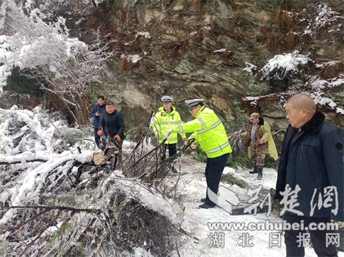 24日下午16時許,茅箭區大川鎮開始降雪,道路濕滑,大川派出所民警在出警回所途中發現五條嶺隧道附近有車輛打滑,下車提醒過往車輛安裝防滑鏈、減速慢行、注意安全。24日下午17時許,十堰市鄖西縣湖北口回族鄉高山地區下起了雪。派出所民警迅速反應,開展道路交通安全巡查,并及時清理路旁竹木等被積雪壓倒后形成的路障,為積雪路段過往群眾提供幫助。同樣,21時30分,在雨夾雪的房縣,交警四中隊民警在轄區巡邏中發現,軍店鎮月明村路段因雨雪天氣,將路旁的竹竿壓垮,導致一側道路無法通行,民警現場清理竹竿,消除安全隱患。