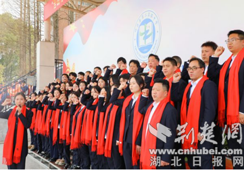 隨后,全體高三教師面對師生家長莊嚴宣誓。“在這百日沖刺階段,我們將以更飽滿的熱情,不遺余力,勇往直前,苦戰百日,用拼搏煥發最耀眼的光芒,金榜名題。”高三學子錚錚誓言,振奮人心,響徹云霄。
