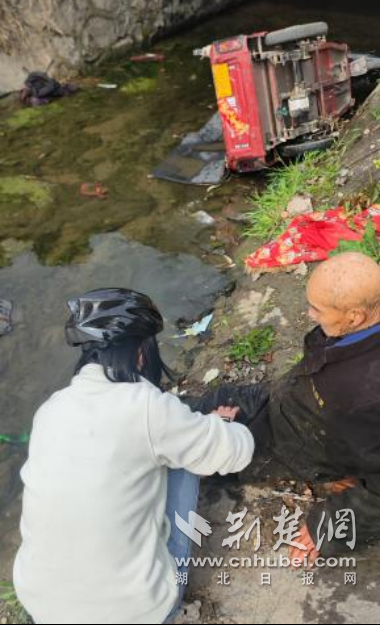 據介紹,事情發生在3月5日上午,湖北醫藥學院第四臨床學院襄陽校區實習調休的學生王艷和同伴劉豐羽,正在戶外騎行鍛煉身體,突然看到路邊一名村民焦急揮手喊著救人,隨即停下前去查看情況。兩人發現,一位老爺爺與三輪車一同翻入3米多深的小橋溝中,全身濕透,情況危急。