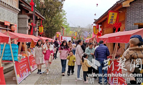 在軍店鎮下店子老街,“鄉約三月三·軍店趕大集”民間市集同步開市,沿街擺放的70個展位擺滿了黃酒、羊肚菌、紅薯粉條、豆油精等當地的農特產品、特色小吃、手工制品等商品,游客漫步老街,感受熱鬧的集市、選購心儀的產品。