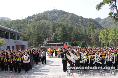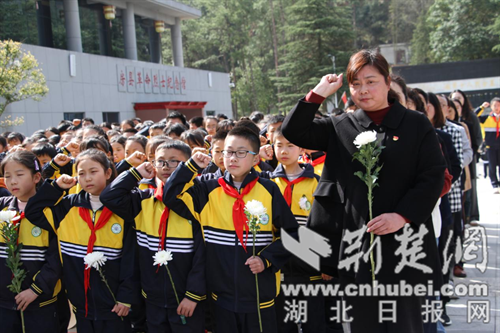 清晨9時許,薄云輕掩,烈士塔前師生們手持白菊整齊列隊,在莊嚴肅穆的革命烈士紀念碑前,通過集體默哀、敬獻花籃、擦拭碑體等儀式,深切緬懷長眠于此的紅軍烈士。此后,學生代表深情誦讀《永不褪色的豐碑》原創詩歌;師生集體鏗鏘宣誓“人民為先,祖國為上”的誓言;該校全國優秀少先隊輔導員甘成潔老師現場講述《半條棉被》的房縣改編版,系列活動的開展,將紅色種子播撒進少年心田。