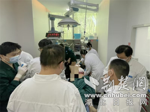 11時(shí)44分,患者被直升機(jī)安全轉(zhuǎn)運(yùn)回院,隨即被送入創(chuàng)傷救治綠色通道。重癥醫(yī)學(xué)科、急診科、創(chuàng)傷骨科、胸外科、胃腸外科、肝膽胰腺外科、骨關(guān)節(jié)科、脊柱外科、神經(jīng)外科等多學(xué)科專家迅速展開聯(lián)合救治。經(jīng)檢查,患者被診斷為創(chuàng)傷失血性休克、胸腹部及雙下肢多處開放性損傷、腸缺血壞死、開放性氣胸、肋骨及股骨骨折、頸椎損傷以及全身多處軟組織損傷。目前,患者已轉(zhuǎn)入該院重癥醫(yī)學(xué)科接受進(jìn)一步治療。