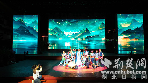 隨后,原創音舞詩畫劇《遇見竹山》震撼上演,演出分為庸王點兵和再遇桃花源兩幕,庸王點兵通過巫舞、士兵操練舞、憂傷的庸女群舞和庸女士兵雙人群舞,展現出古庸國的歷史文化。再遇桃花源,綠松靈石的力量將女大學生帶回桃花源,并偶遇山林間穿行的陶淵明,陶淵明對她講述了桃花源的見聞。整場演出融合音樂、舞蹈、詩歌、情景表演于一體,演繹竹山(古庸)歷史上最具代表性的故事和片段,加入皮影剪紙、竹山高腔、官渡民歌、堵河號子、竹山牌子鑼、綠松石雕刻技藝等竹山典型性非遺元素,展現竹山精神風貌和文化品格,表現竹山人民生生不息的強大精神內核和對美好生活的向往,讓人們在藝術中感受竹山的魅力與活力。