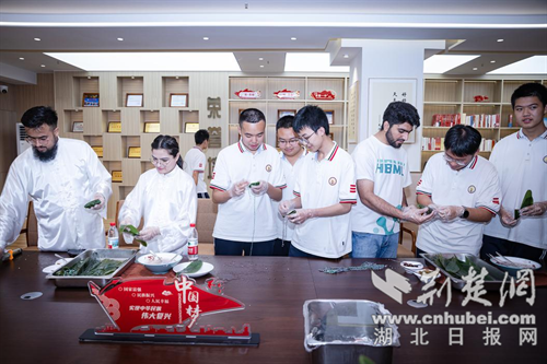最具煙火氣的包粽子環節將活動推向高潮。中外學生分組協作,從粽葉折疊、糯米填充到棉線纏繞,在手把手教學中感受端午民俗的溫度。來自巴基斯坦的留學生卡米表示:“第一次包粽子很有趣,原來每一片粽葉都包裹著中國文化的味道?!?/p>