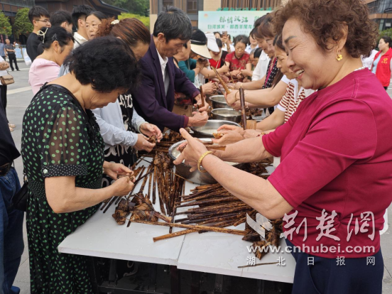 一旁的農副產品展銷區同樣熱鬧,白河縣的木瓜蒜蓉醬、花椒醬,羊尾鎮的板橋豆干、紅薯粉條、木瓜酒等特色產品琳瑯滿目,吸引群眾駐足品嘗選購。