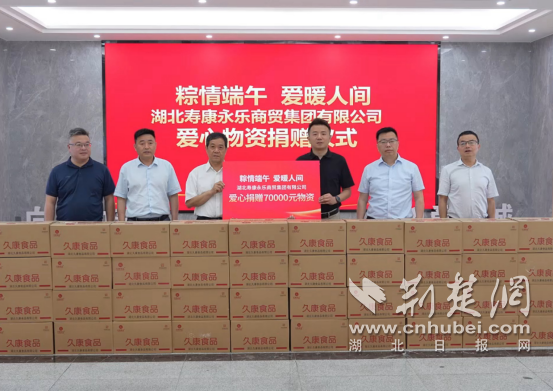 荊楚網(湖北日報網)訊(通訊員 易維)5月30日,壽康永樂集團相關負責人一行來到十堰市慈善總會,送上價值7萬余元的久康福粽、久康糕點、咸鴨蛋等一批節日物資,委托市慈善總會轉交市社會福利院、市老年人養護中心、市特殊教育學校等8家社會機構特殊群體,傳遞壽康永樂滿滿的節日祝福,市慈善總會會長師永學、副會長邵際軍等領導參加捐贈儀式。