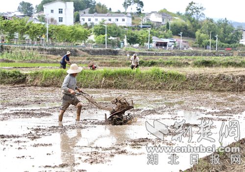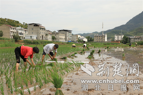 在竹山縣寶豐鎮(zhèn)連片的水田里,旋耕機(jī)翻起層層泥浪,農(nóng)戶們正彎腰插秧,動作嫻熟地將一株株嫩綠的秧苗插入水田。雖然天氣炎熱,但大家干勁十足,一派繁忙景象。
