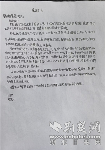 荊楚網(湖北日報網)訊(通訊員 戢子軒 張雪婧)“警察叔叔,感謝你們幫我找回了準考證和身份證!”5月31日,十堰某高中高三學生小劉將一封感謝信送到十堰市公安局茅箭區分局朝陽路派出所民輔警手中,感謝民警幫助回遺失的準考證和身份證。