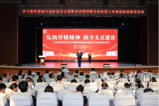 該活動由湖北省總工會主辦、湖北省教科文衛體工會承辦、湖北醫藥學院協辦,是湖北省高校系統武漢市外首場勞模宣講會。活動以“弘揚勞模精神 助力支點建設”為主題,通過勞模事跡講述與情景劇展演相結合的形式,生動展現了新時代勞模群體的奮斗風采。來自十堰市各高校的上千名師生到場聆聽,兩千余名觀眾通過直播同步觀看。