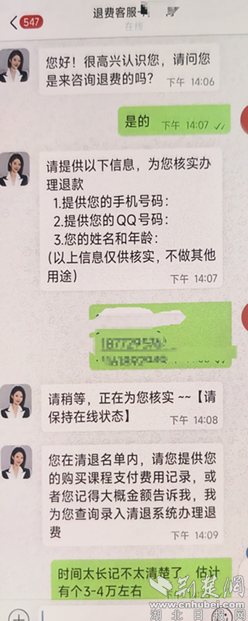 冒充培訓機構客服聊天截圖。 通訊員 供圖