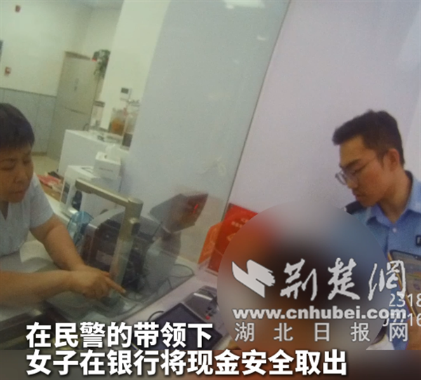 女子在民警帶領下在銀行取現金。通訊員供圖