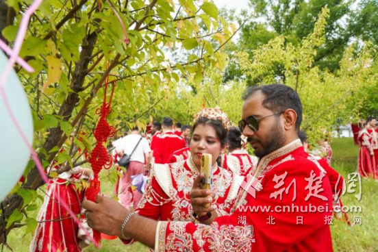 來自孟加拉國的Mohammda和Naher是湖北工業(yè)大學的學生,兩人在同行來中國的路上結緣,因喜愛中國傳統(tǒng)文化特意到鄖西參加中式婚禮;來自北京的李磊與郭晶,本來約定29日領證,從網(wǎng)絡得知鄖西集體婚禮活動后,決定推遲領證日期,不遠千里趕赴鄖西參加活動,以此紀念。