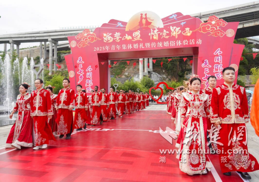 當日上午9時許,鄖西水韻廣場摩肩接踵。隨著國潮樂聲鏗鏘響起,77對新人著中式婚服,宛若一條流動的朱紅色星河。他們十指相扣,踏著綿延的絳色長毯徐步前行,來到舞臺中央。