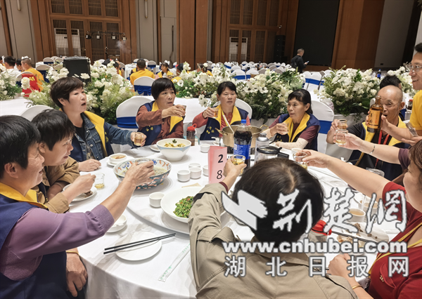 當晚,武當一夢廣場擺起200多席的千人宴,歡迎遠道而來的閩臺游客。2700名游客圍坐共進晚餐,共同品嘗武當特色菜肴、同飲房縣黃酒。天空雖然飄著雨,卻絲毫不減游客們的熱情,不少游客品嘗后現場下單選購,并留下工作人員聯系方式。