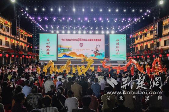 荊楚網(湖北日報網)訊(通訊員 章偉 徐丹)非遺潤竹山,匠心桃花源。10月7日晚,湖北省竹山縣桃花源街區女媧廣場燈火通明,2025年優秀非遺傳承人頒獎暨展演活動在此舉行,3000余名游客與市民駐足觀賞,沉浸式感受傳統技藝的文化魅力。這場“靜態展示+動態表演”的文化盛宴,正是當地以非遺激活文旅產業融合發展的生動縮影。