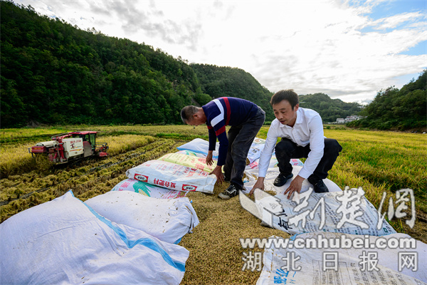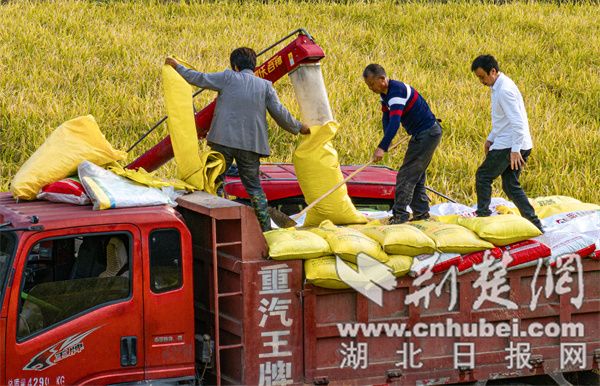 荊楚網(湖北日報網)訊(通訊員 石濡華 王元進 馮定武 )10月13日,竹山縣擂鼓鎮董家溝村150畝“旱改水”項目區內的富硒晚稻豐產熟透,該村組織收割機械乘著天晴,搶收稻谷,裝運至護駕糧食機烘車間,連夜烘干,確保顆粒歸倉。
