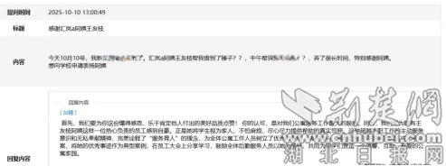 荊楚網(湖北日報網)訊(通訊員 鄭語晨)“我只是做了分內的事,沒想到孩子這么細心,還特意去系統里表揚我,心里特別暖?!苯?,湖北醫藥學院后勤管理處宿管阿姨王友枝收到了一份特殊的“禮物”——來自學生通過學校官方“學生訴求快速響應系統”提交的一封表揚信。這封表揚信,像一股暖流,不僅傳遞著一份感激之情, 更透露出湖北醫藥學院在學生管理服務中具有溫度的人文關懷。