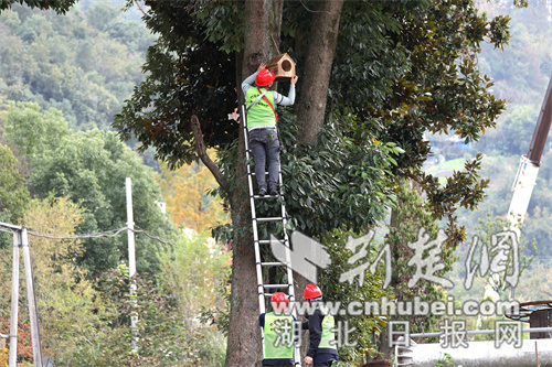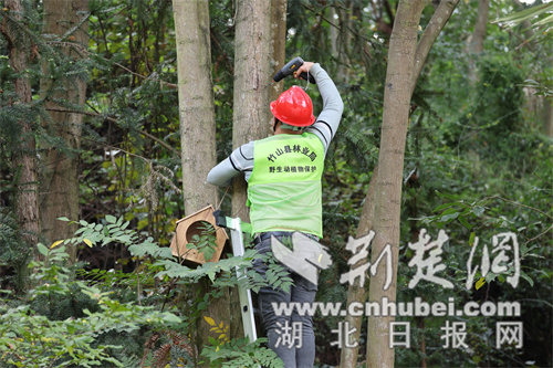 活動現場,縣林業局野保站工作人員與志愿者們分工協作,穿梭于林間安裝鳥巢。這些鳥巢堪稱鳥類的“個性化住宅”:針對山雀設計的精致“單間”小巧玲瓏,為喜鵲等中型鳥類打造的“套房”寬敞舒適,專為“鳥中仙子”白鷺定制的開放式“別墅”更是貼合其棲息習性。工作人員小心翼翼地將鳥巢固定在樹枝高處,每一個動作都飽含對鳥類的關懷。