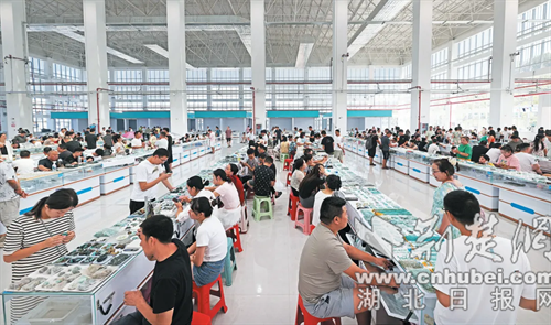 從竹山縣城出發,經麻安高速,約25分鐘便到達麻家渡鎮。該鎮是全國綠松石集散中心,獲評中國“淘寶鎮”,鎮內營盤河村、羅家坡村被命名“淘寶村”。集鎮沿305省道而建,加工、銷售綠松石的商鋪一個挨一個,綿延3公里,被稱為“寶石一條街”。每天,各家店鋪的工作人員直播、雕刻、拋光,忙得熱火朝天,從天南海北來這里“淘寶”的人也是絡繹不絕。