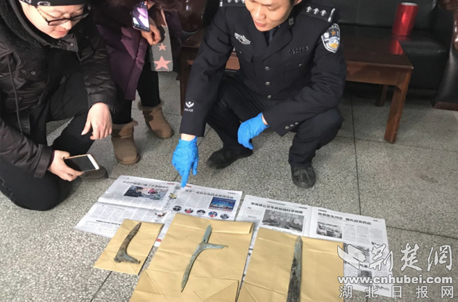 1月8日上午,警方統一收網。在隨州一出租屋抓獲犯罪嫌疑人4名,搜獲文物青銅劍、青銅戈共三件,同時搜出洛陽鏟、探針、探頭、絞盤等大量盜墓工具。但為首的一名賈姓男子不在,1月9日上午,專班民警偵查后在鹿鶴市場附近將準備逃往外地的賈某抓獲。