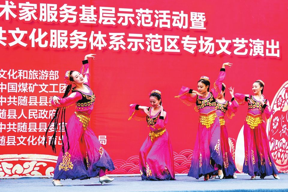 1月15日,2019年文化和旅游部藝術家服務基層示范活動暨湖北省第三批公共文化服務體系示范區專場文藝演出活動在隨縣厲山鎮啟動。該活動為期三天,將分別在隨縣厲山、新街、洪山、三里崗、柳林、唐縣鎮演出6個專場,以營造關注農業、關心農村、關愛農民,全面推動實施鄉村振興戰略,打贏脫貧攻堅戰,助推農業農村現代化的濃厚氛圍。圖為中國煤炭文工團表演的舞蹈。(隨州日報全媒體記者李文軍、通訊員韓鐵流攝)
