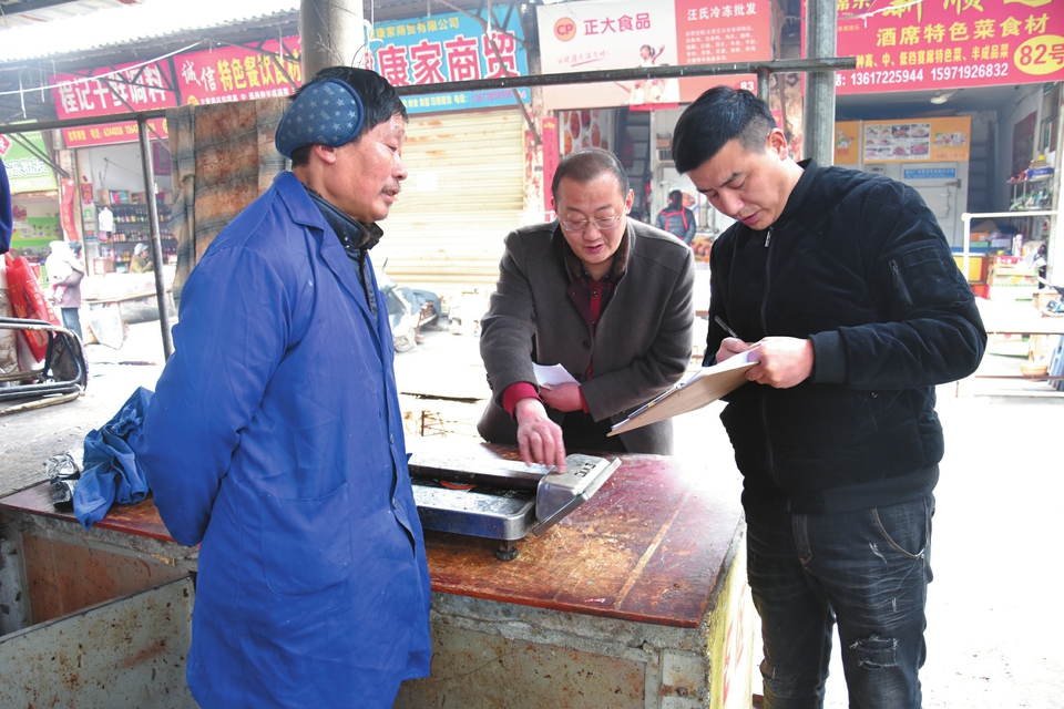 2月25日,廣水市公共檢驗檢測中心、質監局等部門聯合組成計量檢定專班,對城區集貿市場計量器具開展集中質量檢定活動,揪出市場上的“黑心秤”。(隨州日報通訊員劉冬、羅鑫攝)