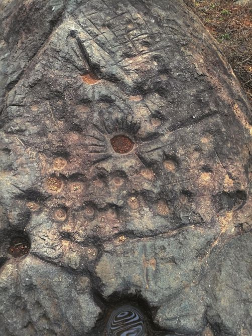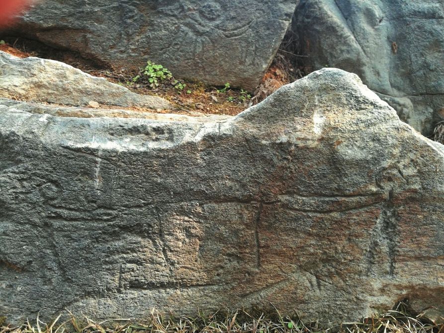 溪流旁的一片開闊地上,刻有巖畫的山石密集而種類繁多,在眾多抽象符號中,出現了兩人手拉手的圖案。