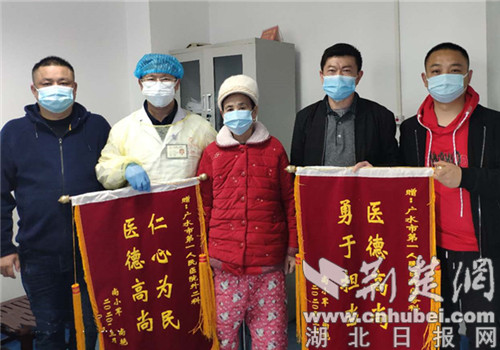 3月30日,聶女士病情好轉(zhuǎn),出院回家休養(yǎng)。身體轉(zhuǎn)好后,聶女士在家屬的陪同下,將兩面分別寫著“醫(yī)德高尚 勇于擔(dān)當(dāng)” 、“仁心為民 醫(yī)德高尚”字樣的錦旗親手送到了廣水一醫(yī)院醫(yī)務(wù)科主任雷楚林和普外科主任程燈手中,來表達(dá)她的深深謝意。
