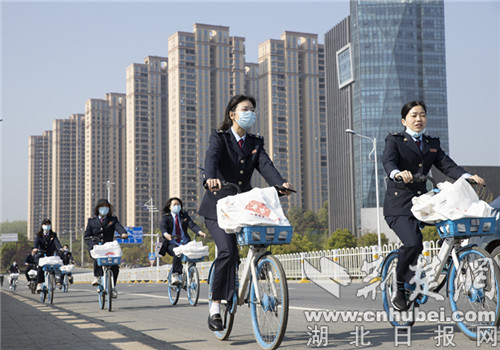 活動當日,30余名稅務干部統一騎上共享單車,從隨州萬達廣場出發,沿白云湖綠道一路騎行,經316國道稅法宣傳走廊折返,全程7公里。白云湖邊春花爛漫,楊柳垂腰,綠水盈盈,生態綠與稅務藍相互交織,吸引過往行人側目關注。