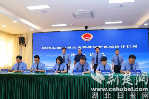 在隨州市檢察院宣讀《關于建立桐柏山淮河源生態環境保護跨區域協作機制的意見》和《關于開展“2021年桐柏山淮河源生態環境保護公益訴訟專項行動”的實施方案》起草情況說明后,南陽、信陽、駐馬店、襄陽、孝感、隨州市檢察院負責同志共同簽署《關于建立桐柏山淮河源生態環境保護跨區域協作機制的意見》。