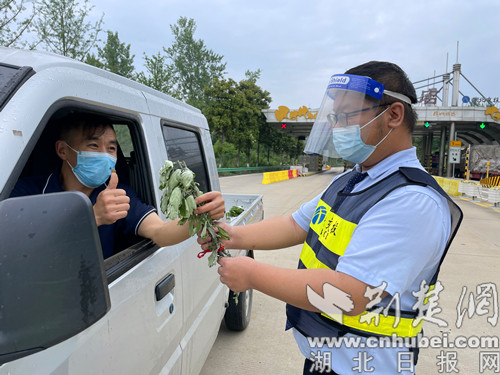 收費(fèi)站職工向司乘送艾草。通訊員供圖