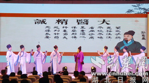 “凡大醫治病,必當安神定志,無欲無求,先發大慈惻隱之心,誓愿普救含靈之苦…。”節目在優美的音樂聲中拉開序幕,領誦者聲情并茂地帶領8名弟子誦讀《大醫精誠》,演繹了醫道精微、心懷至誠、言行誠謹的醫道傳承。